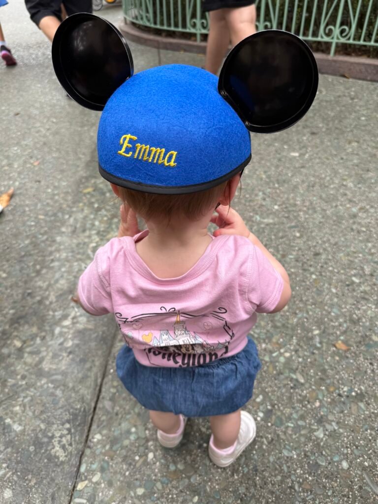 After Jungle Cruise we headed back to Fantasyland to see if Peter Pan’s Flight wait time had gone down (it had not). Instead, we decided to ride Snow White (wait time <10 minutes). We then headed over to the Mad Hatter in Fantasyland to purchase our daughter her first Mickey ears! There was an infant Mickey ears hat that said “First Visit” — it was perfect! I have a Mickey ears hat at home, with my name embroidered on it, so we had to do the same for our daughter. We spent $30 after the embroidery, which I believe was around $8.