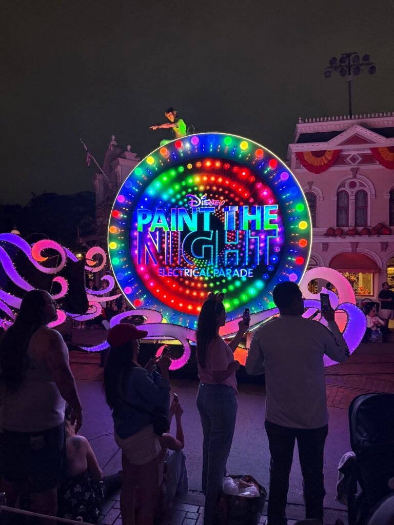 After dinner, we walked towards Fantasyland (again to check Peter Pan’s flight – wait time was even longer at this time), so we booked another Lightning Lane attraction for It’s A Small World. It was getting dark at this time so we knew the night was coming to an end for our daughter (as she normally goes to bed around 7:30pm). However, we had saved what turned out to be the best ride for last! She LOVED It’s a Small World! She was enthralled by the music and the lights!