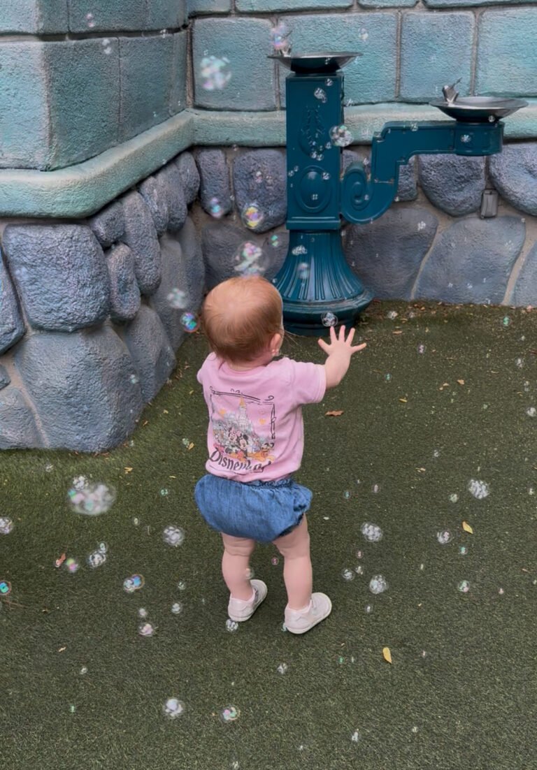 A little girl and her dad were playing with a Disney bubble wand and our daughter wondered over (attracted to the bubbles) and started playing with the little girl. This is how we found out our daughter LOVES bubbles and how my parents ended up buying her a bubble wand from Disneyland!