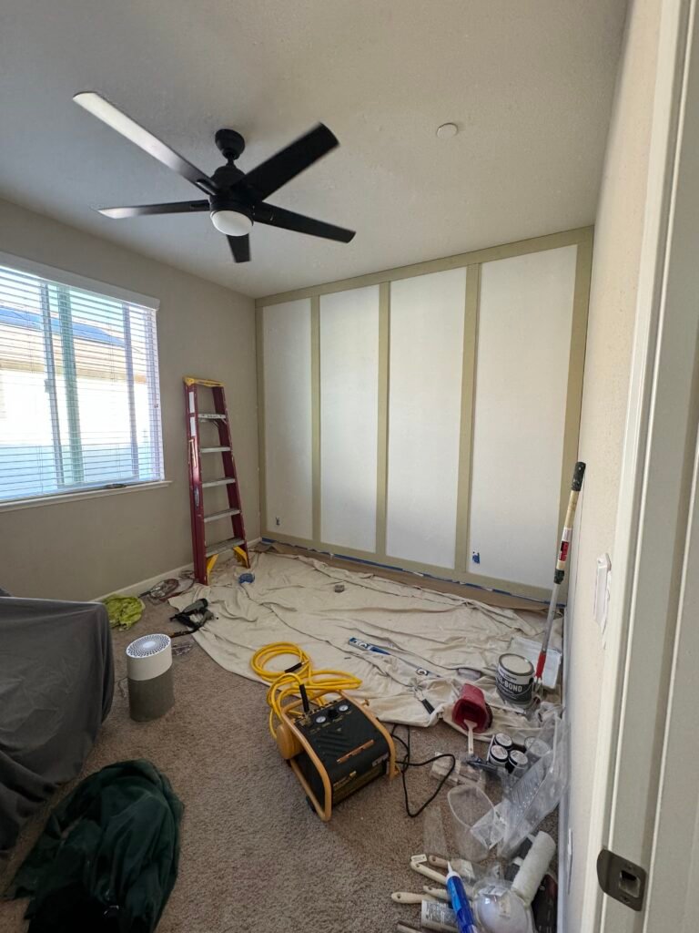He can speak to the details involved in creating the accent wall, but I can provide a high-level overview. First, since the wall was textured, my husband had to smooth out the wall. He thinned out a joint compound and spread on the wall. He then had to sand it down to make it smooth and even. He applied primer on the freshly smoothed out wall after that.