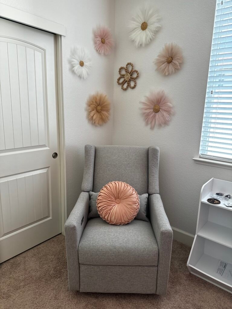 The wall prints would help decorate the right side of the wall with the window. The other side of the wall with the window had the glider in the corner. I found these super cute flowers in varying sizes/colors to go on the wall (thanks TikTok). The different sizes allowed me to take up more or less wall space depending on the look I was going for. Given the closet spacing, I was able to put the flowers on two different walls, so they sort of encapsulated the glider.