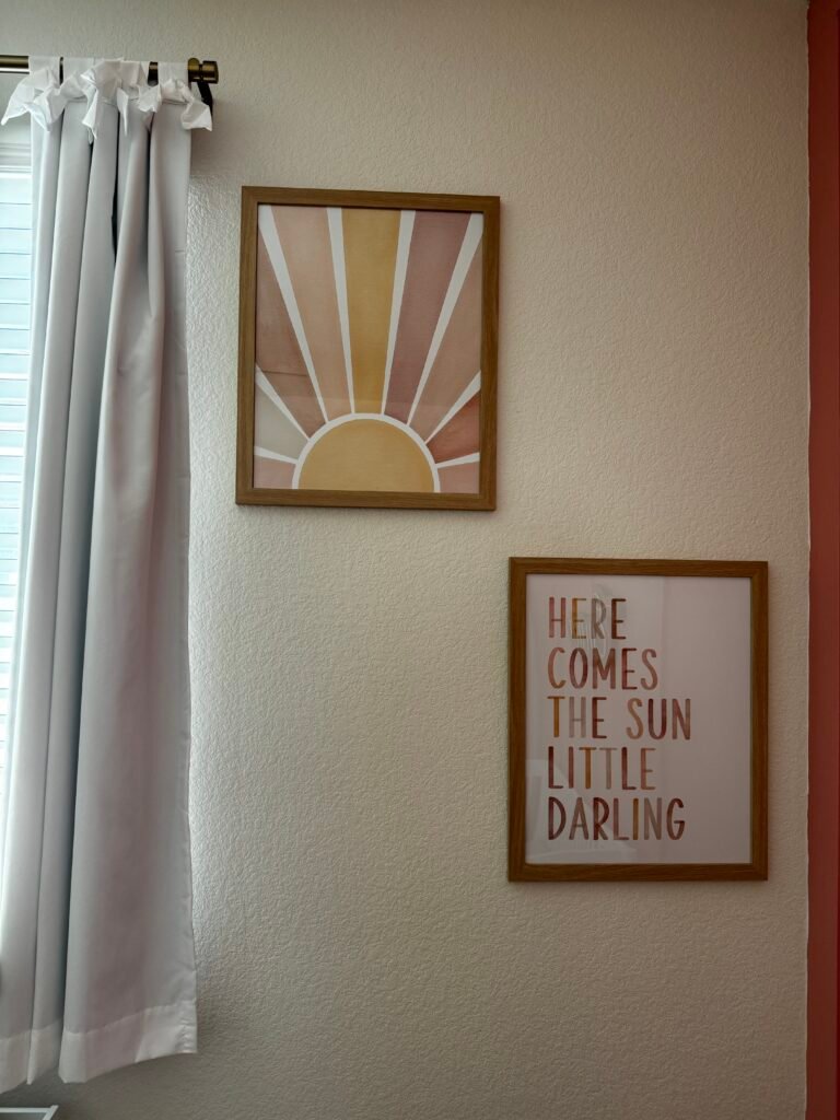 I’m not sure how I even found it (I couldn’t find in my inbox) — I assume some Pinterest search of “boho chic wall decor”—but I found the cutest prints for wall decor. I ordered the prints online and then printed at my local Walgreens. My husband and I have always loved the Beatles — our bridal party walked down the aisle to ‘Here Comes the Sun’. As such, when I saw these wall prints, I knew they would make the perfect addition to the nursery! The coloring of the prints ties in with the coral accent wall, and the sun design ties in with the rug pattern.