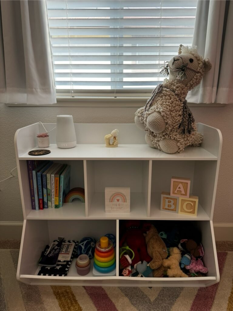 Lastly, I purchased a toy shelf on Amazon to help store all of the toys and books for my daughter. I also bought these super cute ABC block letters on Etsy to use as shelf decor. My daughter still loves playing with them today — taking them on and off the shelf. Her toy shelf has only grown with even more toys now, and we rotate them out for her.