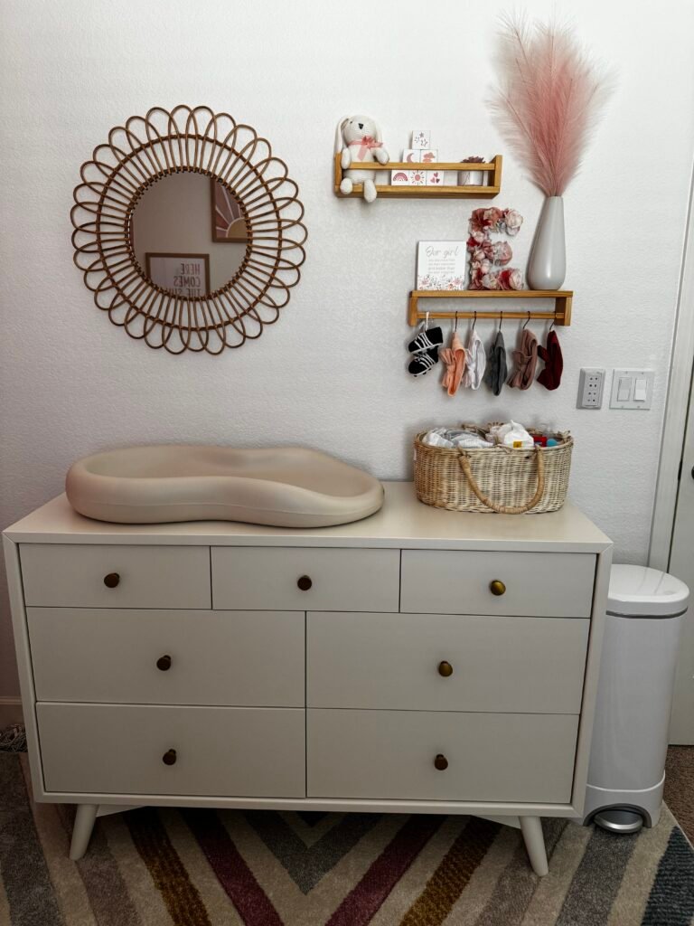 Honestly, there are so many ways to organize a nursery dresser. I highly recommend watching TikToks or looking on Pinterest for ideas — it really helped me figure out how exactly I wanted to organize. You’ll want items that you need immediately in the dresser, so you don’t step away from the changing pad with baby.